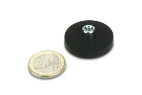 The largest and strongest rubber coated base pot magnets with internal threaded bushing are applicable to heavy duty hanging and lifting.